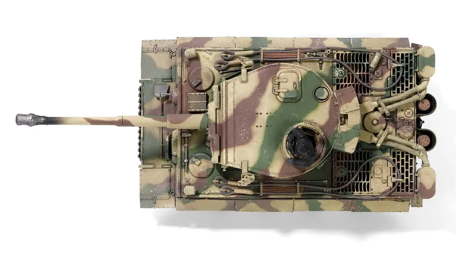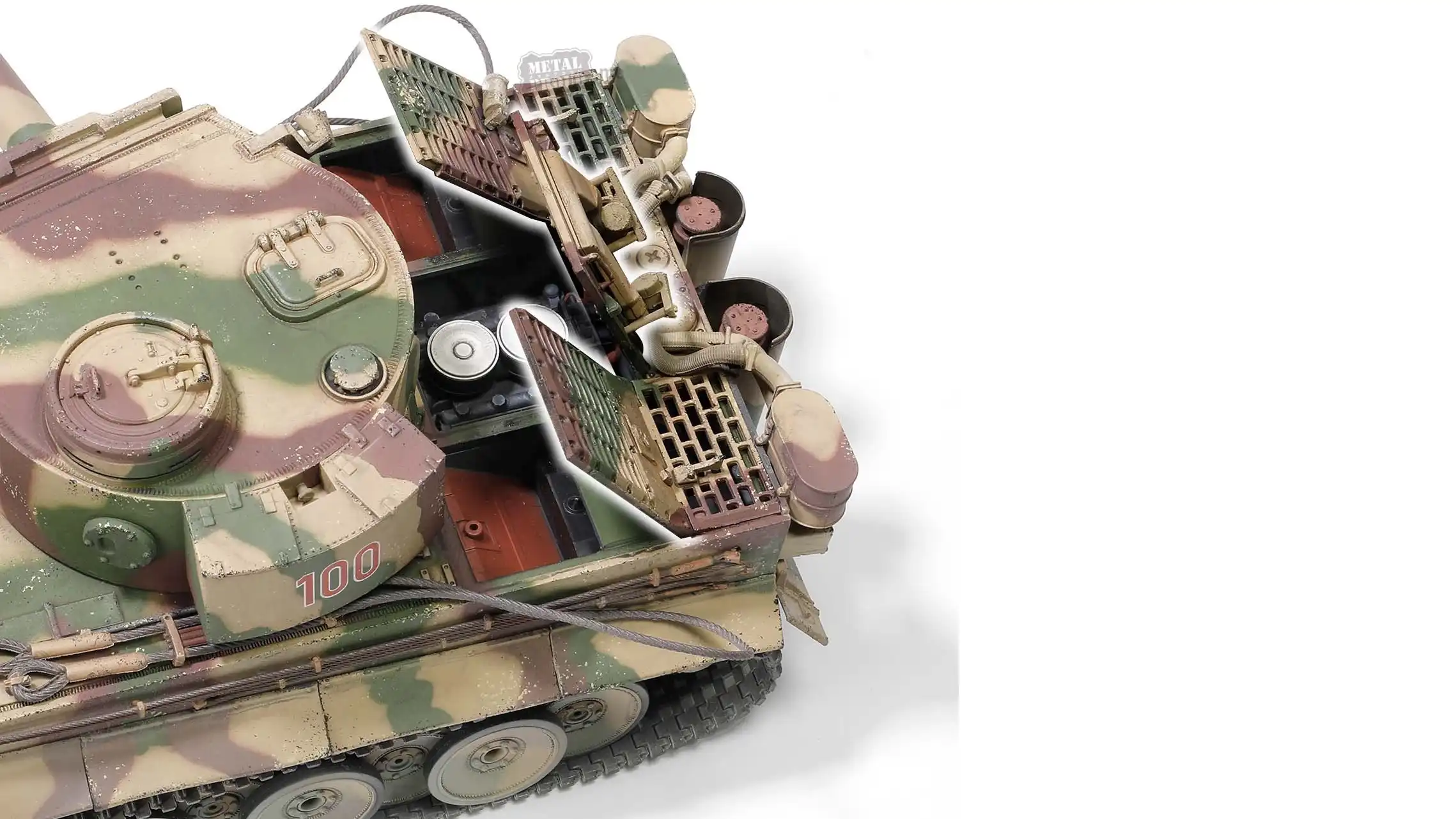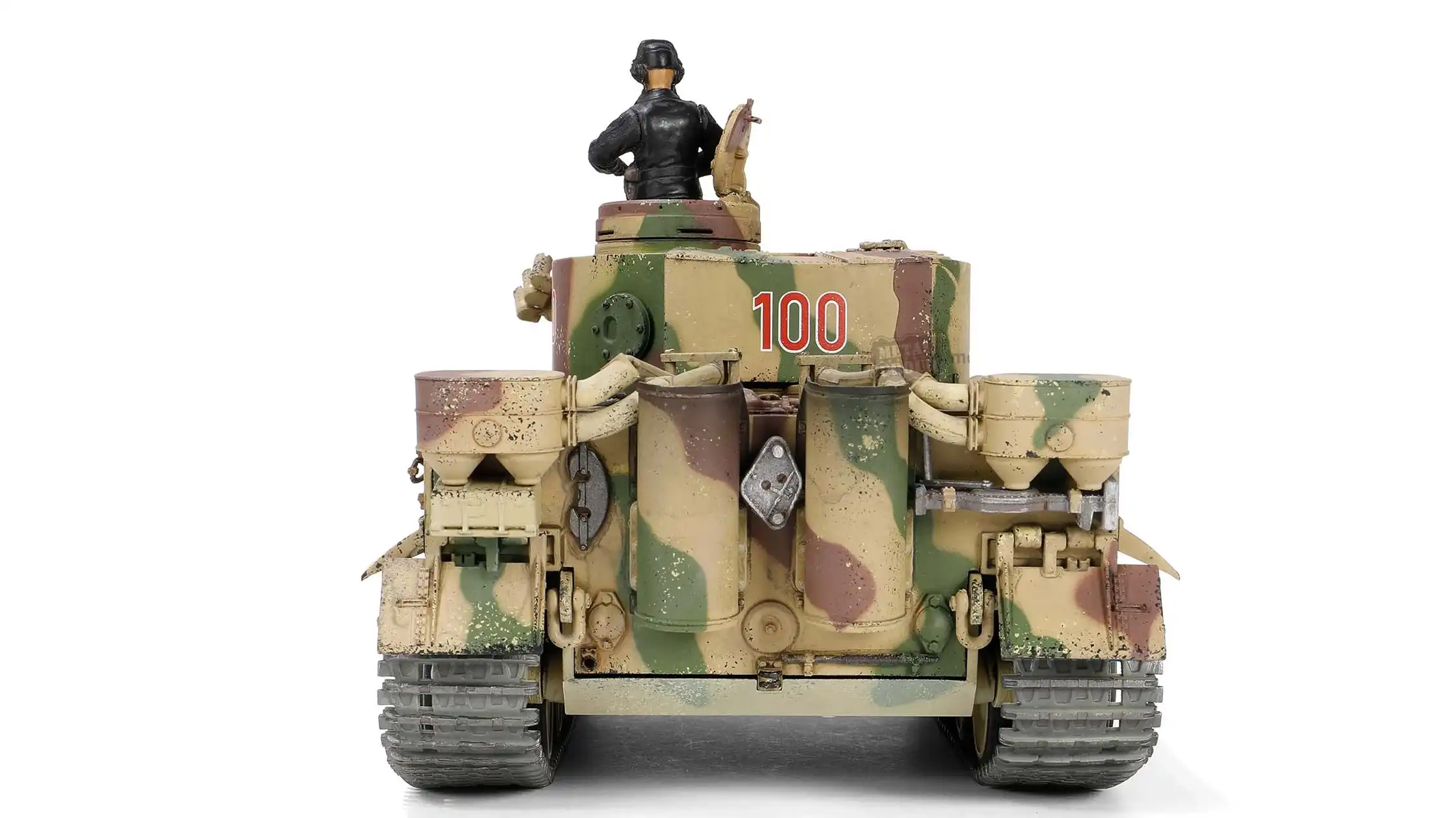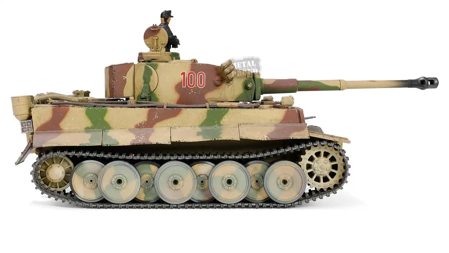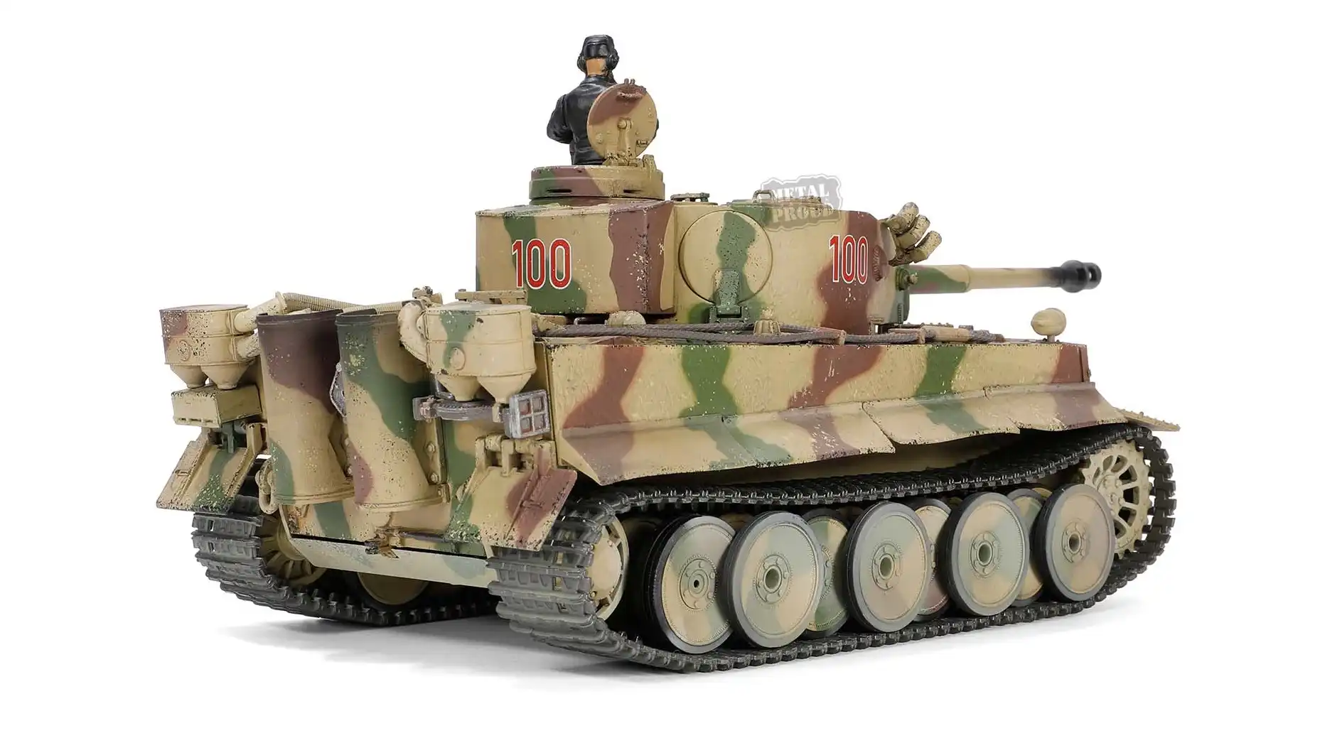 این مدل نمایانگر نسخه تولید اولیه Tiger Ausf. E است؛ با جزئیات مشخص دوران ابتدایی خدمت، استتار عملیاتی جبهه شرق و شماره برجک «100» که بهطور مستقیم به ساختار یگان 505 اشاره دارد. حضور تجهیزات جانبی، چیدمان ابزار و فرم برجک، همگی بازتاب شرایط واقعی میدان نبرد در کورسک هستند.