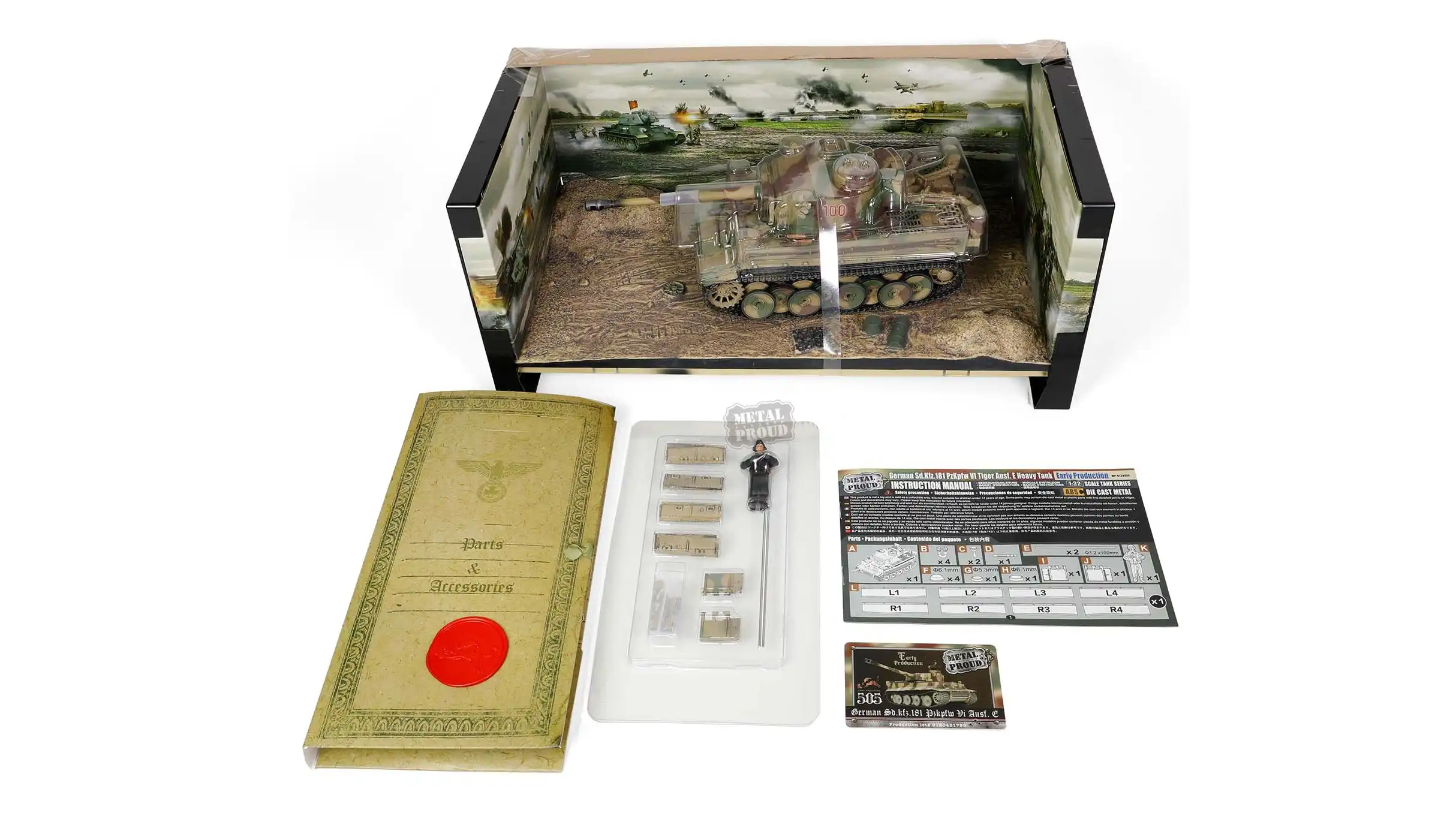 ماکت تانک تایگر در مقیاس 1:32، با دیورامای اختصاصی، بازسازی دقیقی از یکی از شناختهشدهترین تایگرهای جبهه شرق ارائه میدهد؛این ماکت محصول کمپانی Metal Proud است که بهعنوان زیرمجموعهای از برند معتبر Forces of Valor فعالیت میکند.