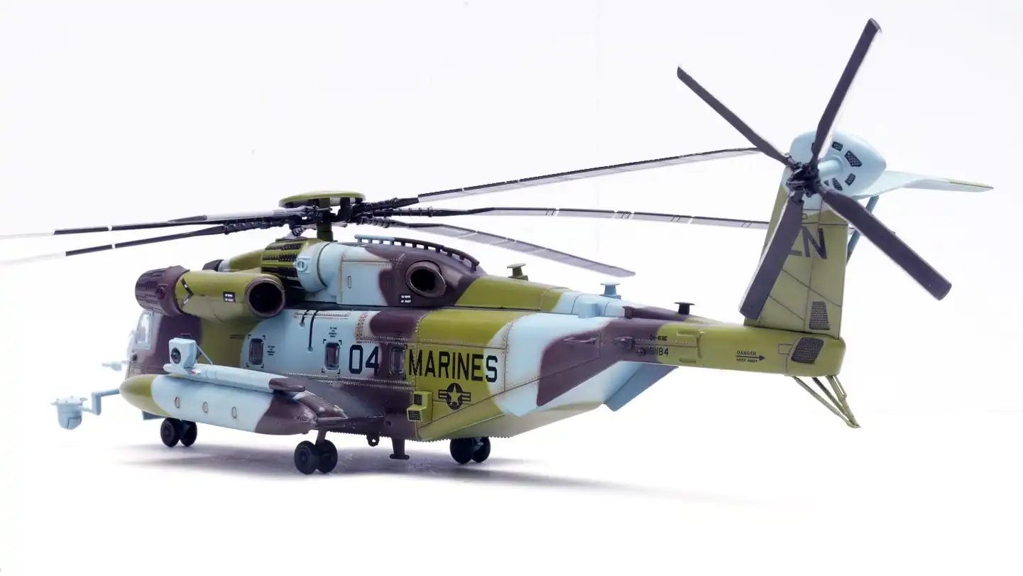 ماکت هلیکوپتر MH-53E سیکورسکی نیروی دریایی امریکا در مقیاس 1:72 و بهصورت Die-cast فلز و پلاستیک توسط کمپانی Panzerkampf تولید شده است. مدل با تمرکز بر بازسازی صحیح فرم بدنه، تناسب ابعادی، رنگآمیزی عملیاتی و جزئیات واقعی اسکادرانی ساخته شده و نمایانگر یک نمونه کاملاً عملیاتی از CH-53E در دوران جنگ خلیج فارس است. این ماکت انتخابی دقیق برای کلکسیونرهای نظامی، علاقهمندان تاریخ هوانوردی و دیوراماهای عملیاتی مدرن بهشمار میآید.